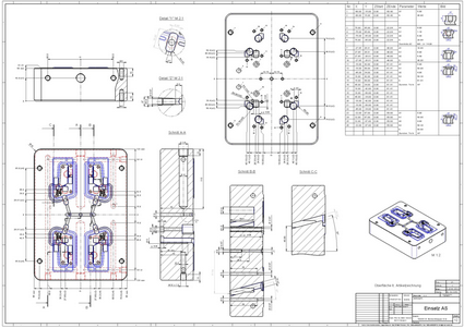 Wir konstruieren Ihr Werkzeug als parametisches Volumenmodell und leiten daraus assoziative 2D-Zeichnungen ab. Sie erhalten je nach Wunsch native Daten (Cimatron 2025) oder neutrale Daten im Step-Format. Die Zeichnungen selbst stellen wir Ihnen im dxf und pdf-Format zur Verfügung, falls gewünscht auch auf Papier. Zusätzlich erstellen wir mit Excel eine detalierte Stückliste, gerne auch nach Ihrer internen Vorlage.